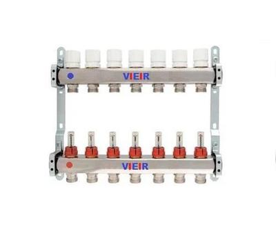 Коллекторная группа для отопления 7 выходов полный комплект (краны, термометры, воздухоотводчики, сливники) 1*3/4 без расходомеров нержавейка Vieir