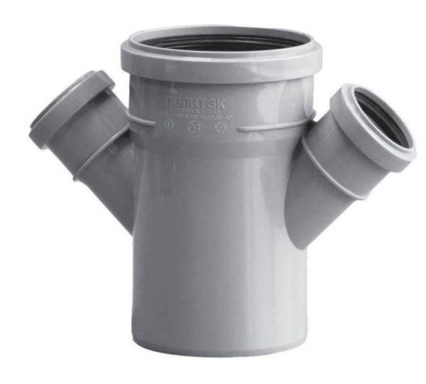 Диаметр дополнительного ответвления может быть равен диаметру основного трубопровода или меньше его. В дробной части обозначения крестовины указывается угол отвода дополнительного ответвления (в данной крестовине он равен 45°). Предлагаемая крестовина обеспечивает подключение к основному трубопроводу диаметром 110 или 50 мм. Материал крестовины - полипропилен.